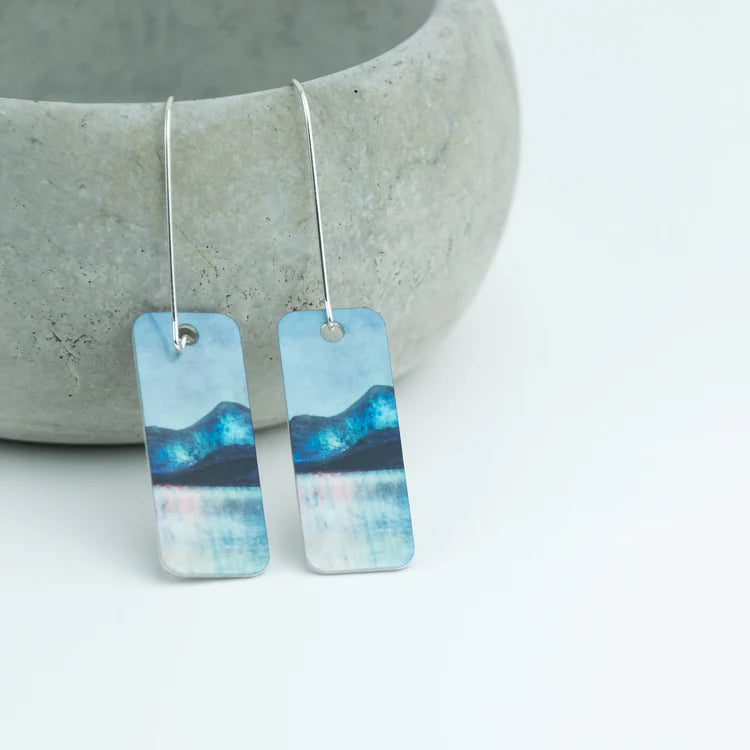 Cath's Scottish landscape artwork on lightweight, hypo-allergenic, glossy aluminium, pendant earrings with 3.6cm long solid sterling silver ear wires presented in a grey two piece gift box.