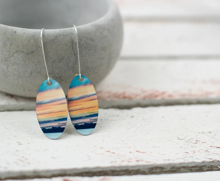 Cath's Scottish landscape artwork on lightweight, hypo-allergenic, glossy aluminium, pendant earrings with 3.6cm long solid sterling silver ear wires presented in a grey two piece gift box.
