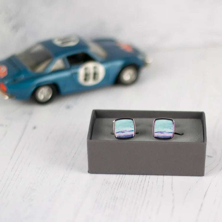 Stylish chrome coloured cufflinks featuring tiny versions of Cath's Scottish Landscape artwork.