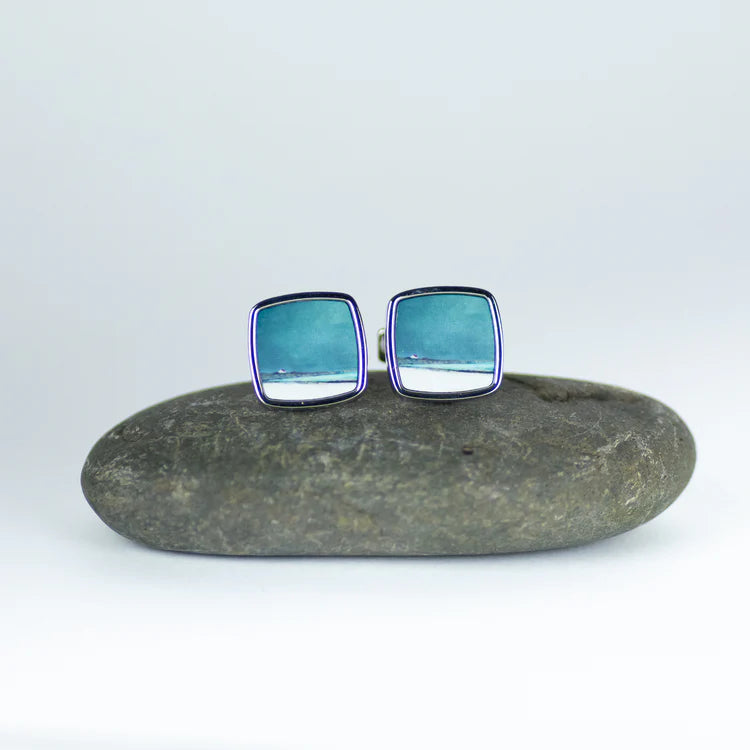 Stylish chrome coloured cufflinks featuring tiny versions of Cath's Scottish Landscape artwork.