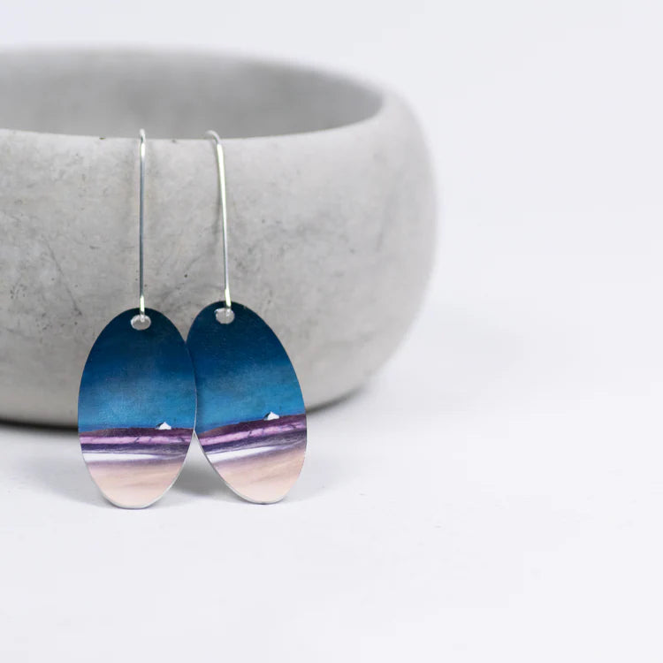 Cath's Scottish landscape artwork on lightweight, hypo-allergenic, glossy aluminium, pendant earrings with 3.6cm long solid sterling silver ear wires presented in a grey two piece gift box.