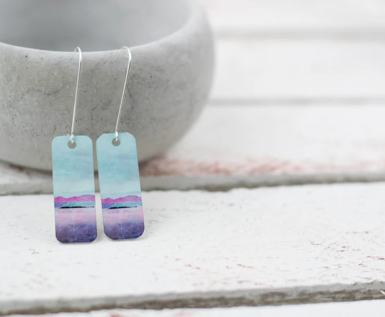 Cath's Scottish landscape artwork on lightweight, hypo-allergenic, glossy aluminium, pendant earrings with 3.6cm long solid sterling silver ear wires presented in a grey two piece gift box.