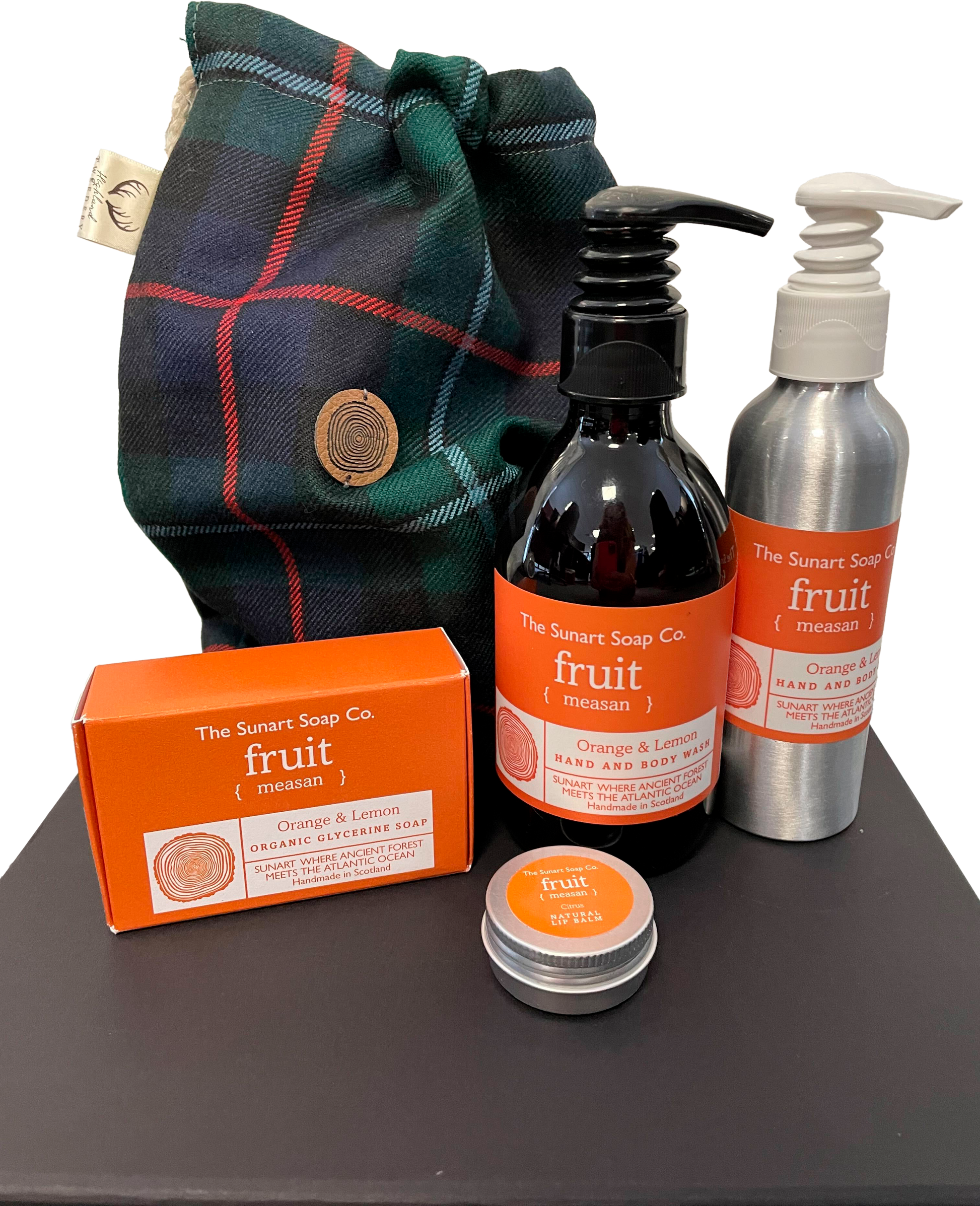 Fruit Gift Set - Handmade especially for The Sunart Soap Co. by The Highland Tweedery using Campbell of Cawder modern Lochcarron tartan, lined with Rose and Hubble polka dot cotton.