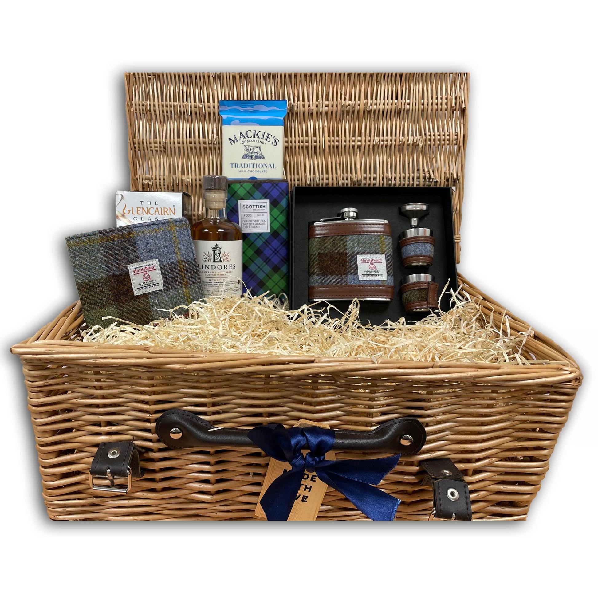 Harris Tweed Hip Flask Set - 6oz Hip Flask Gift Set wrapped in Harris Tweed with Funnel & two cups in Gift Box.