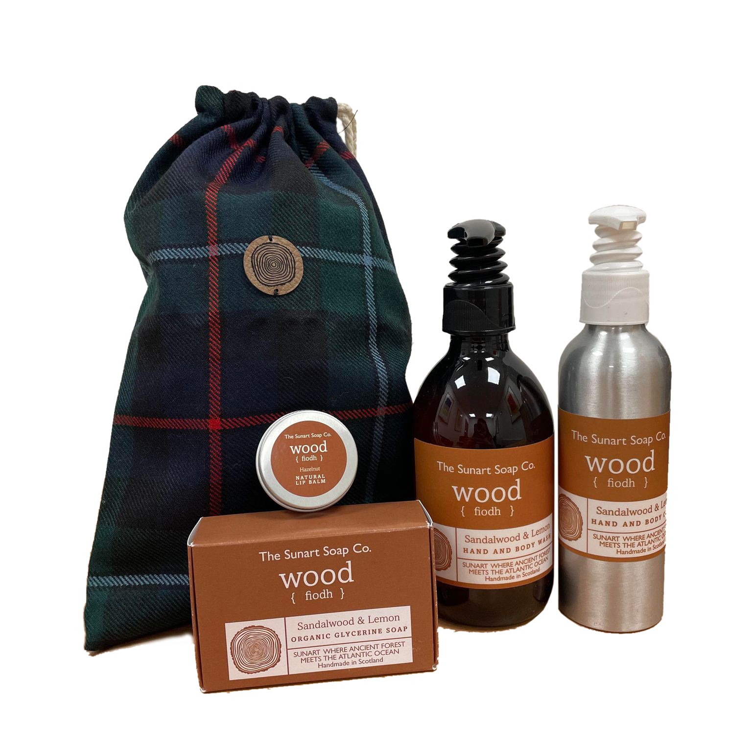 Wood Gift Set - Handmade especially for The Sunart Soap Co. by The Highland Tweedery using Campbell of Cawder modern Lochcarron tartan, lined with Rose and Hubble polka dot cotton.