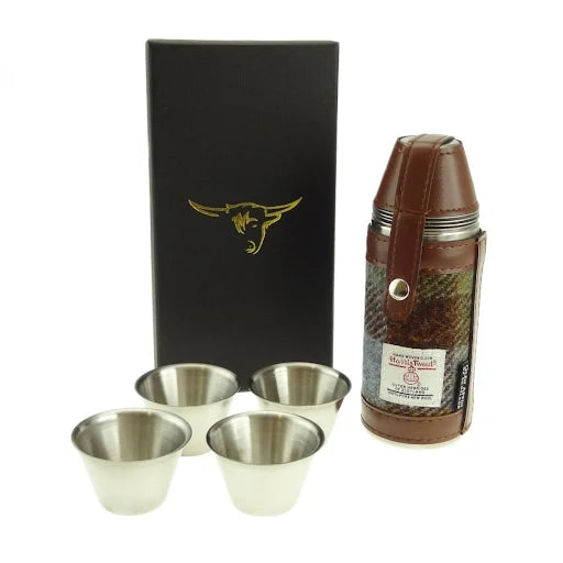 Glen Appin of Scotland Harris Tweed Hunting Flask. An 8oz hunting hip flask with 4 stainless steel cups.