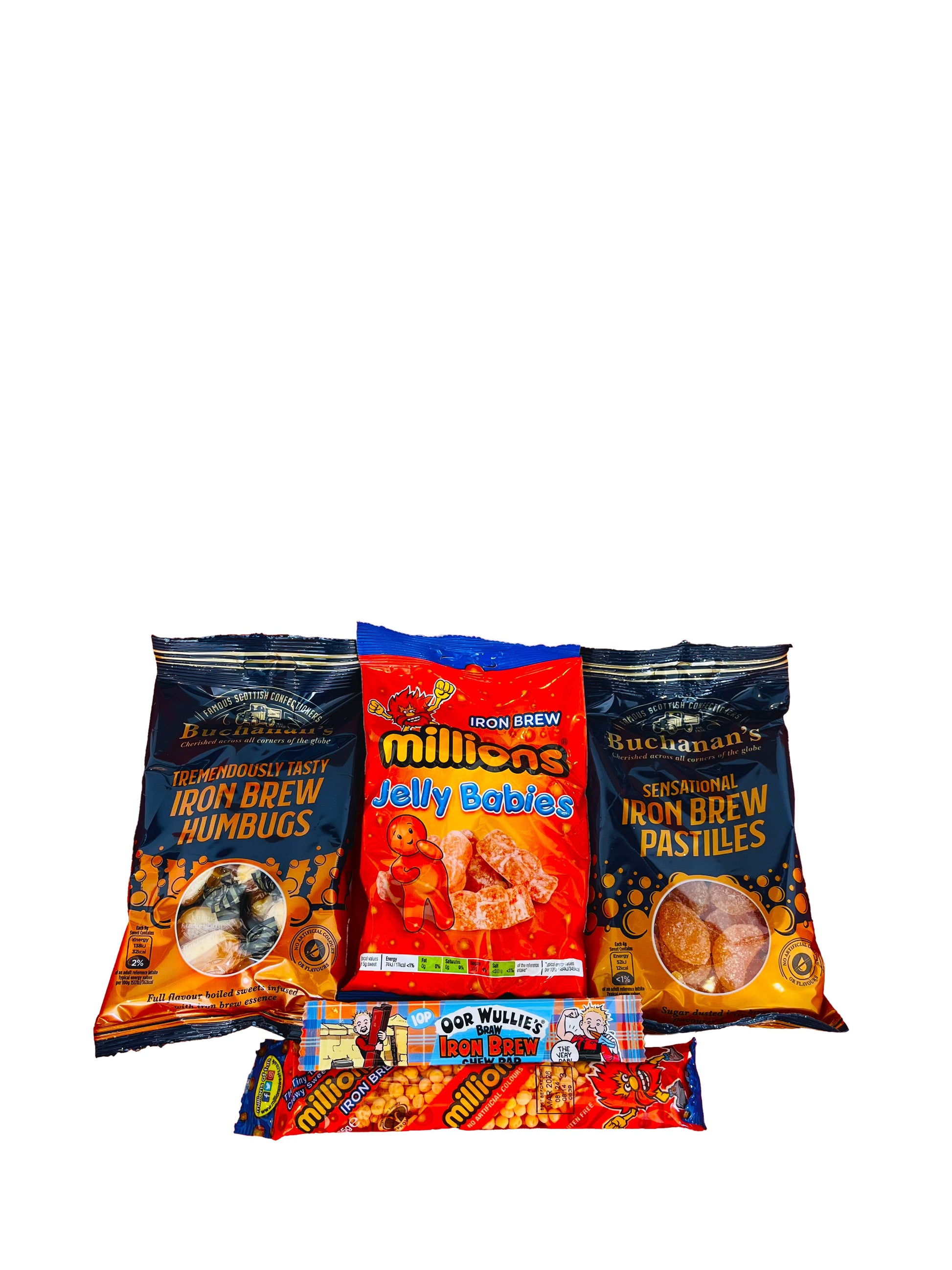 Buchanan's Sensational Iron Brew Pastilles Bag 145g * Buchanan's Tremendously Tasty Iron Brew Humbugs Bag 140g * Millions Iron Brew 55g * Oor Wullie's Iron Brew Chew Bar 11g * Millions Iron Brew Jelly Babies 180g