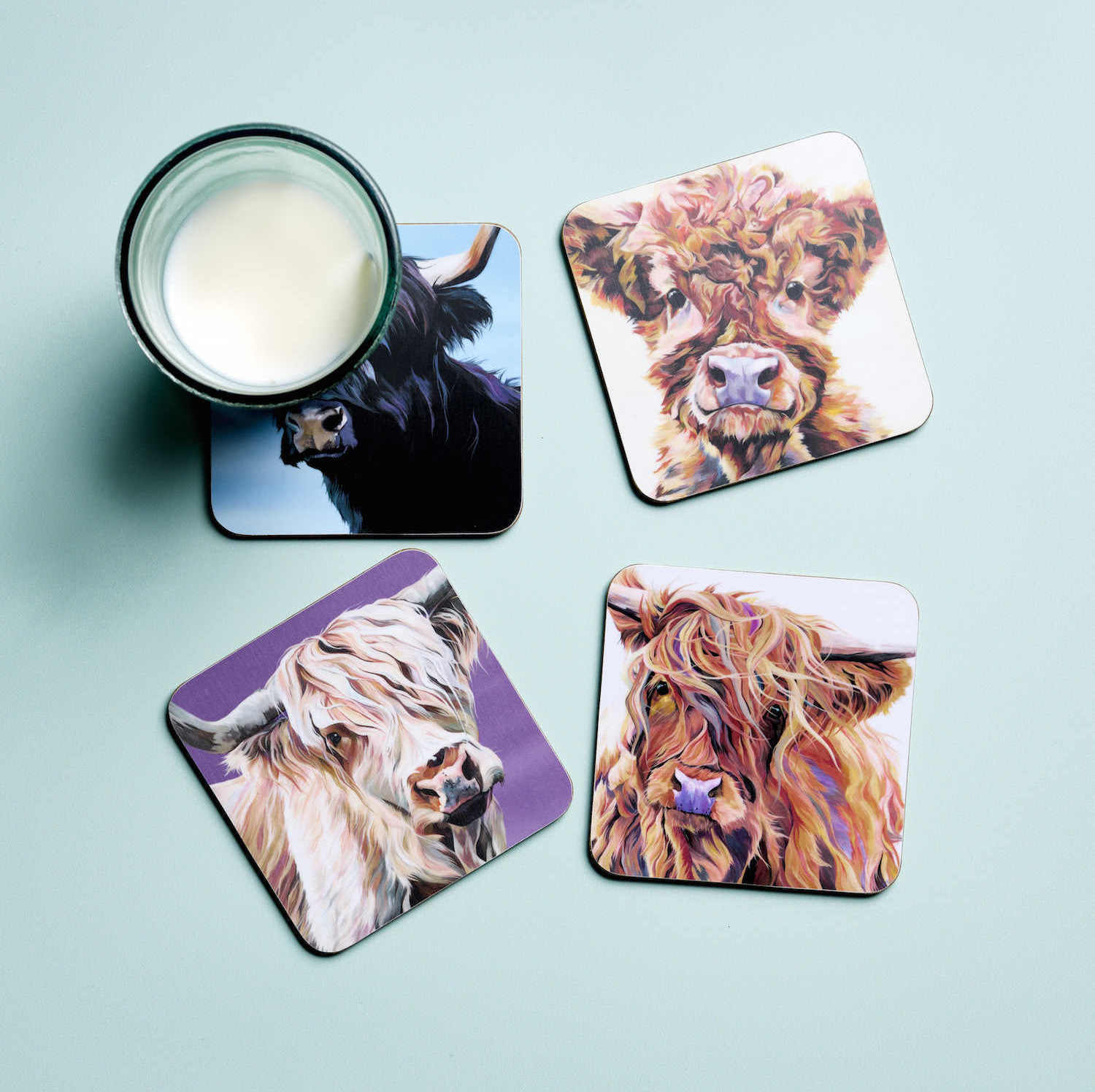 Highland Cow Coasters from Lauren’s Cows! All taken from Lauren’s original paintings, these drinks mats are a great way to add a splash of colour to your table. Made from melamine they are also incredibly hard wearing. No peeling or bubbling here. Now all you have to do is fight over who gets which cow!