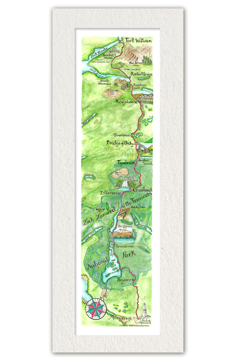 Have you walked the West Highland Way? Do you know someone that has? Our hand-drawn illustration of the iconic 96-mile walk from Milngavie to Fort William presents itself as a lovely memento of this epic adventure across the west highlands of Scotland, taking in stunning scenery through areas including Loch Lomond and Glencoe. We have produced a limited edition version available mounted and ready for framing.