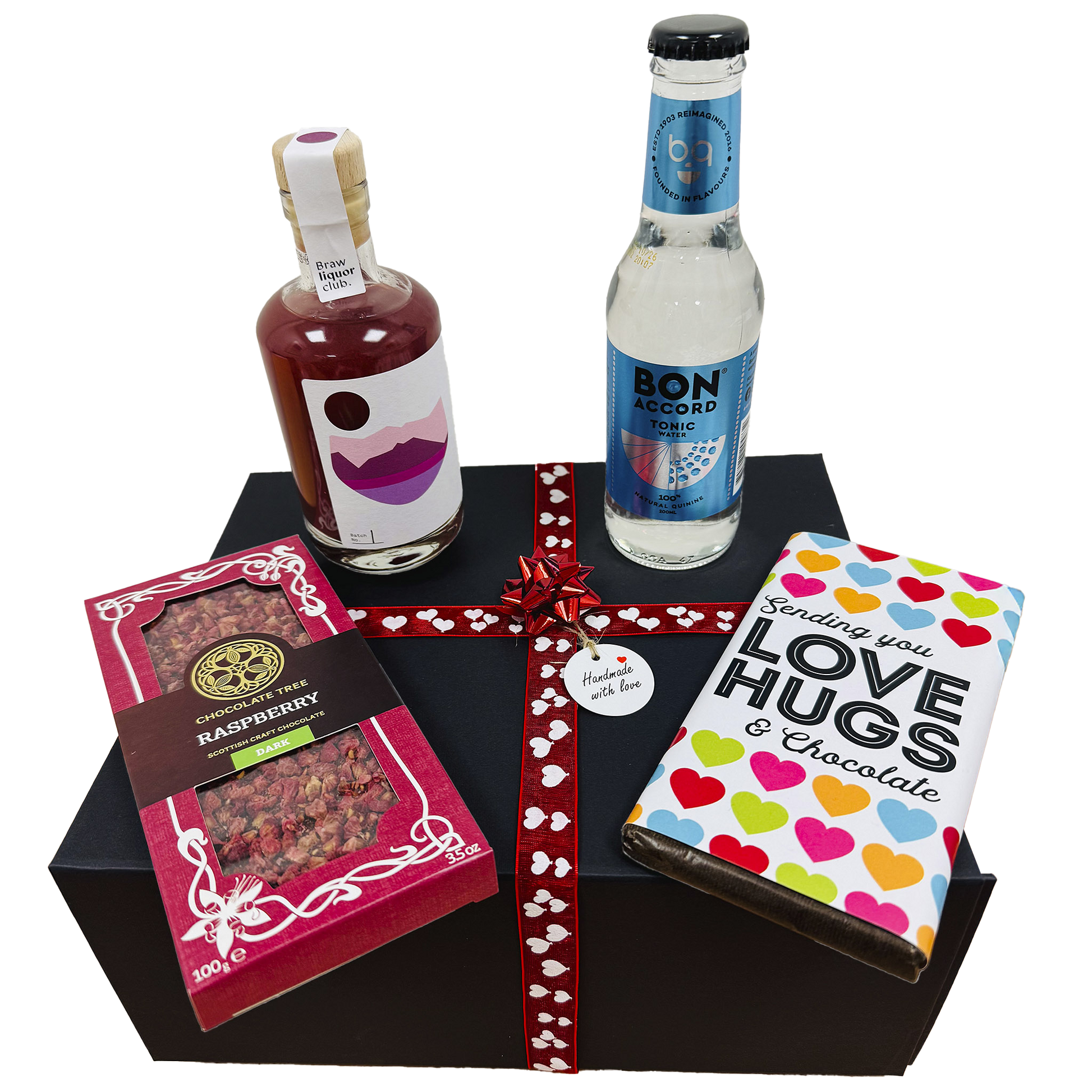 Braw Liquor Club Bramble with Gooseberry Cocktail 200ml * Bon Accord Tonic Water 200ml * Chocolate Tree Raspberry Dark Chocolate 100g * Quirky Chocolate Millionaire's Shortbread 100g