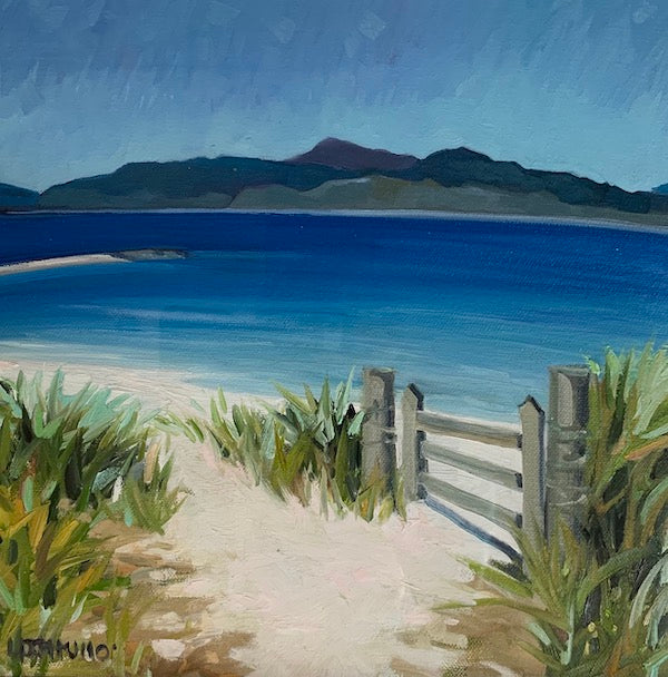 Original painting by Lin Pattullo. Lin works from her studio near Crieff in Perthshire and exhibits in galleries throughout the country. Bright colours and the interaction of light and shade are important ingredients in her work, as is the selection of subjects that catch her imagination – these range from portraits of children on ski slopes or at the seaside, through the peace and curves of little boats at anchor, to scenes of sunny Scottish and Mediterranean villages.