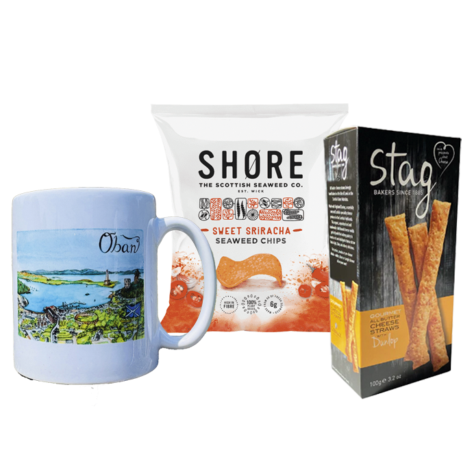 Enjoy a scrumptious Scottish snack combo! For one week only, get a lovely Oban mug, a pack of Shore Seaweed Crisps, and Stag Bakeries Cheese Straws for just £12.99—with FREE delivery included!