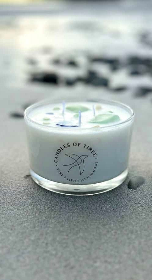 Set in a large frosted glass bowl with three candle wicks and hand-picked sea glass.